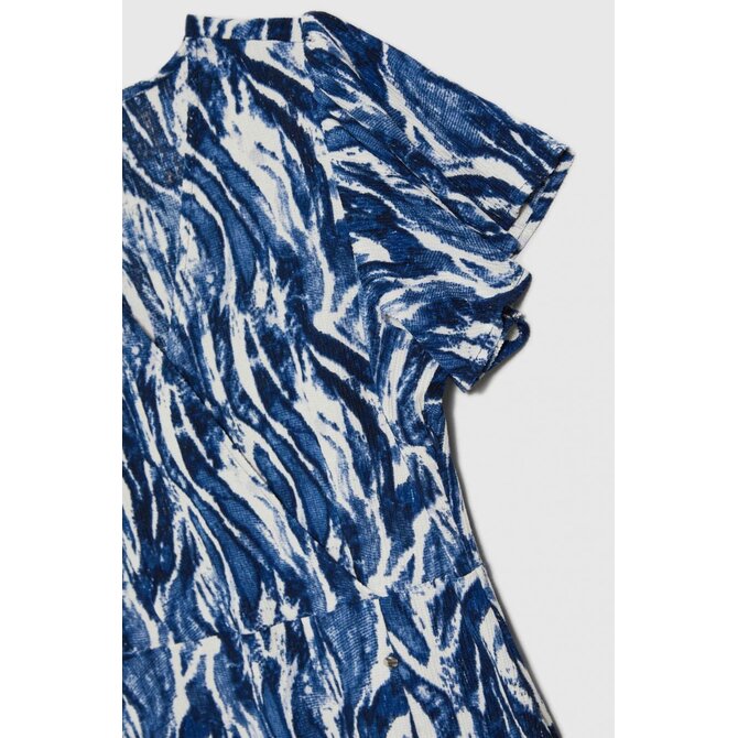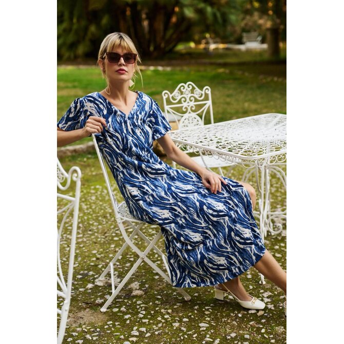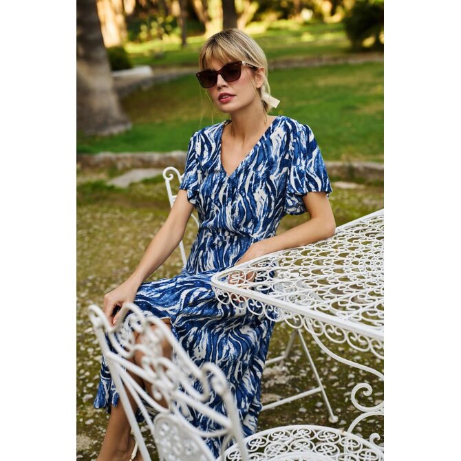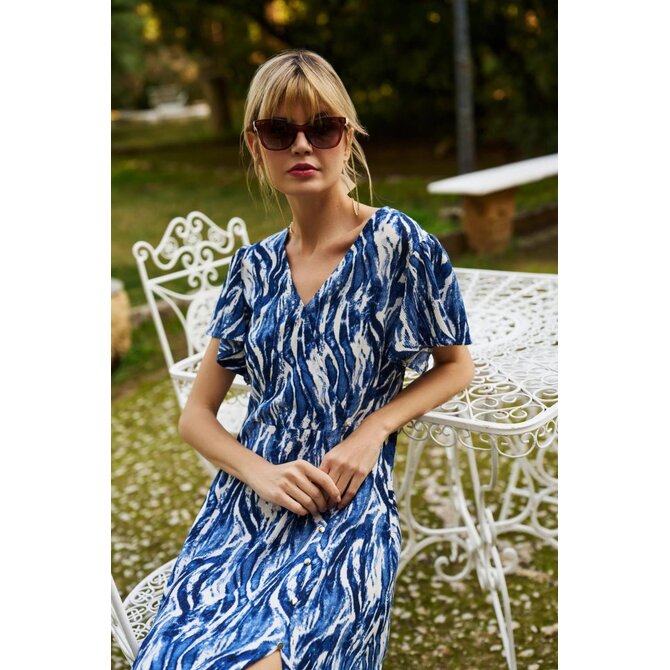 98% POLYESTER, 2% ELASTAN Tmavě modré šaty v originální směsi vzorů zaujmou svým klasickým střihem a elegancí, dokonale zdůrazňují siluetu díky volánkům a rozšířenému spodnímu dílu. Obalový horní díl s výstřihem do V poskytuje pohodlí a zdůrazňuje jedinečný charakter celku. Roztažené rukávy dodávají lehkost a délka do poloviny lýtek dělá tento model vynikajícím svou všestranností. Jemná, měkká polyesterová tkanina zaručuje pohodlí při nošení a snadnou péči. Šaty jsou ideální do práce, na každodenní nošení, na pláž i pro zvláštní příležitosti a hodí se jak k ležérnímu, tak i k elegantnímu stylu. Skvěle se hodí ke klasickým vysokým podpatkům, plochým sandálům, ale i k lehkému saku nebo džínové bundě. Vynikající volba pro vytvoření módního stylu pro každé roční období.