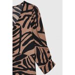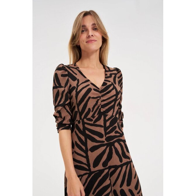97% POLYESTER, 3% ELASTAN Tyto dámské šaty s geometrickým vzorem kombinují klasický styl s módním retro nádechem. Černohnědá barevná kombinace zdůrazňuje všestrannost, zatímco decentní volánky a nafouklé rukávy dodávají eleganci a lehkost. Lichoběžníkový tvar krásně zvýrazňuje postavu a zajišťuje celodenní pohodlí. Úplet s přídavkem polyesteru zaručuje pohodlí, měkkost a odolnost. Šaty sahají do poloviny lýtek a výstřih do V dodává ženský nádech. Ideální pro zvláštní příležitosti, rodinné setkání, elegantní výlety, ale i do práce nebo na každodenní nošení. Perfektně se hodí ke klasickým lodičkám, kotníkovým botám nebo sandálem na podpatku.
