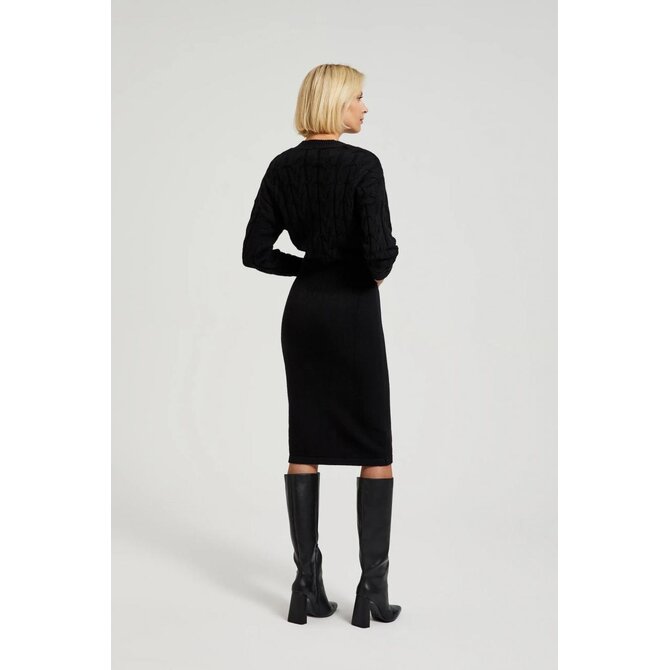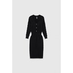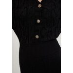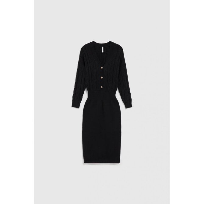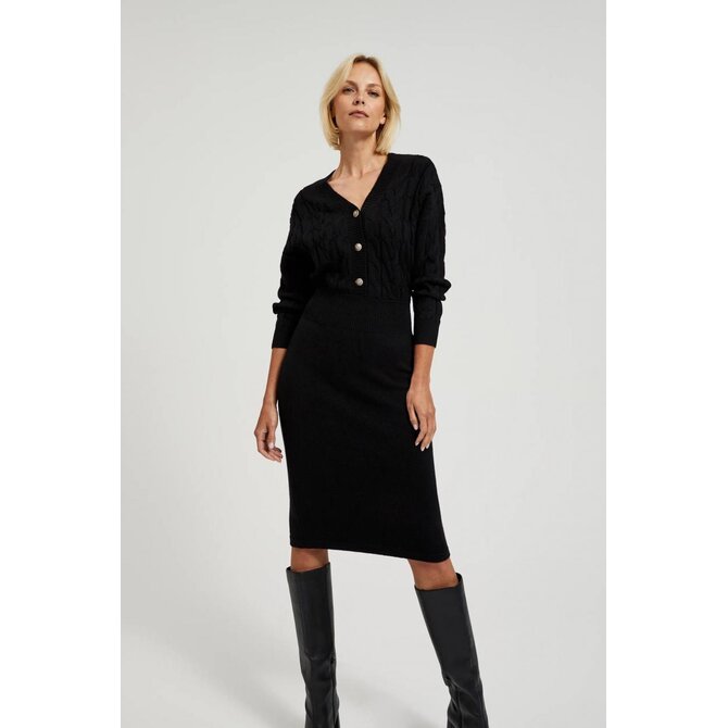 Elegantní černé šaty, vyrobené z vysoce kvalitní viskózy. Model s ozdobnými knoflíky, perfektně padnoucí na postavu. Vyrobeno z měkké tkaniny, která zajišťuje pohodlí při nošení. Šaty jsou ideální pro každodenní použití v kanceláři nebo na obchodní jednání. Výstřih do V a knoflíky dodávají eleganci a třídu. Délka ke kolenům mu dodává eleganci a vypadá fenomenálně. Tyto šaty jsou ideální na obchodní jednání, pracovní pohovory nebo důležité prezentace. Skvěle se hodí k černým vysokým podpatkům a klasické kabelce ve stejné barvě.