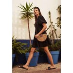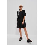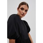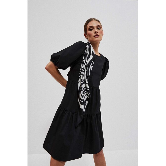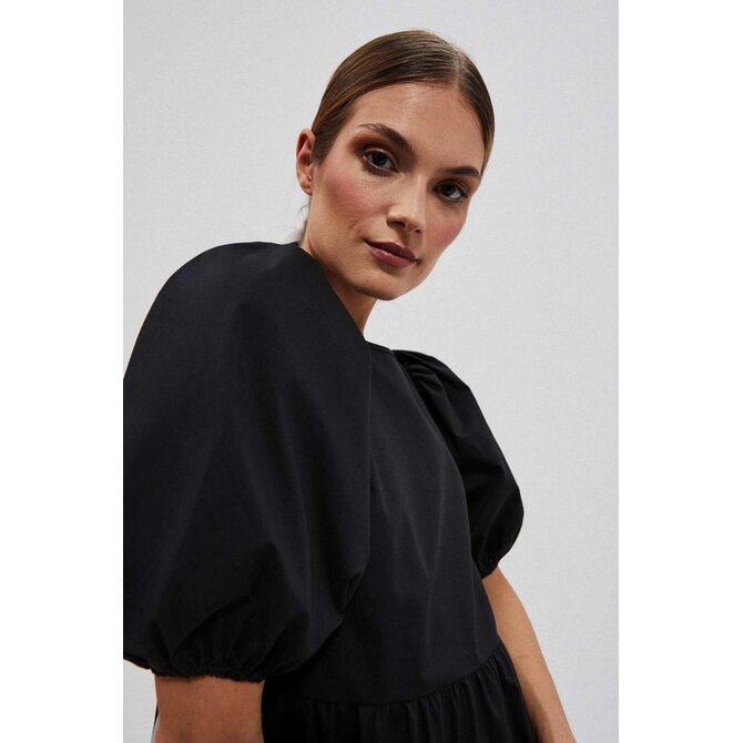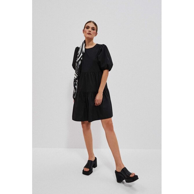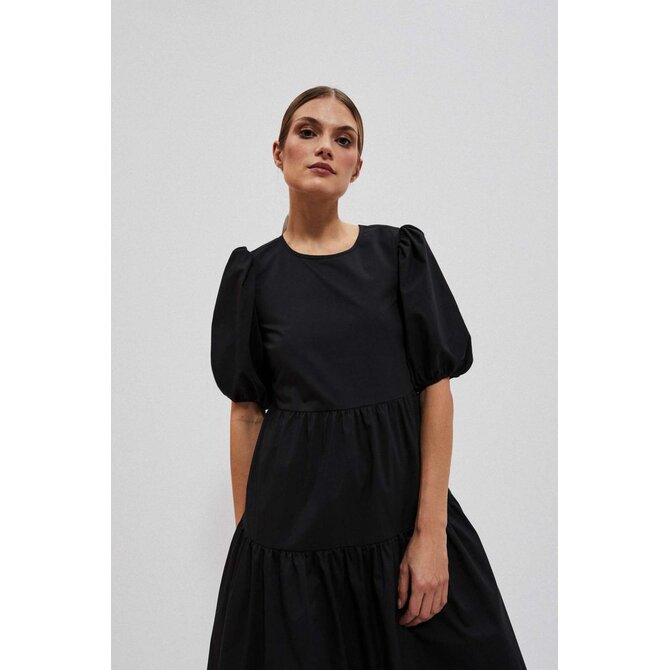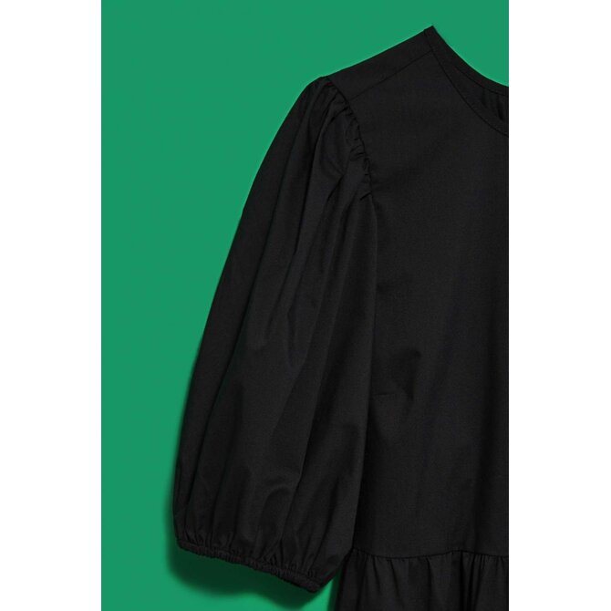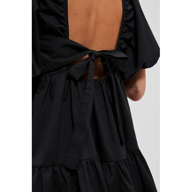 80% POLYESTER, 17% BAVLNA, 3% ELASTAN Černé šaty, hladké a bez vzorů. Kulatý výstřih vpředu. Široké a nabírané rukávy, délka po lokty. Otevřená záda s uvázanou mašlí vzadu. Spodní část šatů je výrazně rozšířena s ozdobnými volány. Délka do půli stehen. Vyrobeno z příjemného a pohodlného materiálu. Dá se nosit jak při speciálních příležitostech, jako jsou svatby, rauty či rodinné oslavy, tak i pro všednější příležitosti, jako jsou setkání s přáteli nebo do práce. Lze jej kombinovat s vysokými podpatky a elegantními šperky pro formálnější příležitosti nebo nosit s kotníkovými botami a lehkým šátkem pro příležitostnější příležitosti. Musíte to mít!