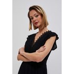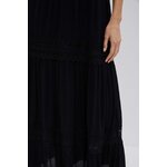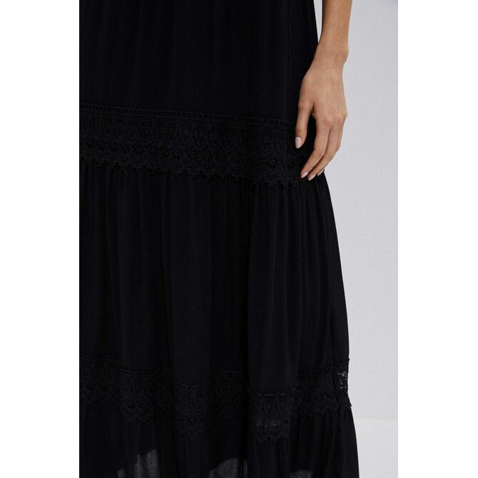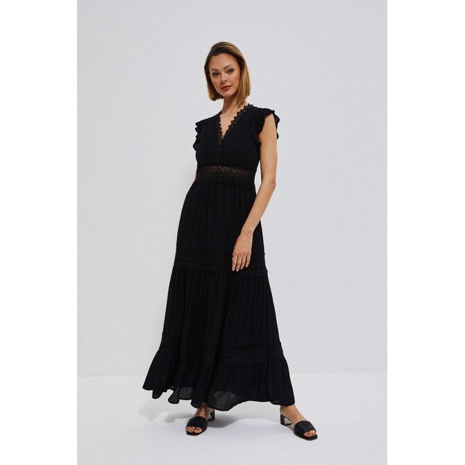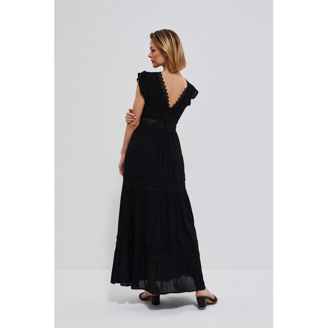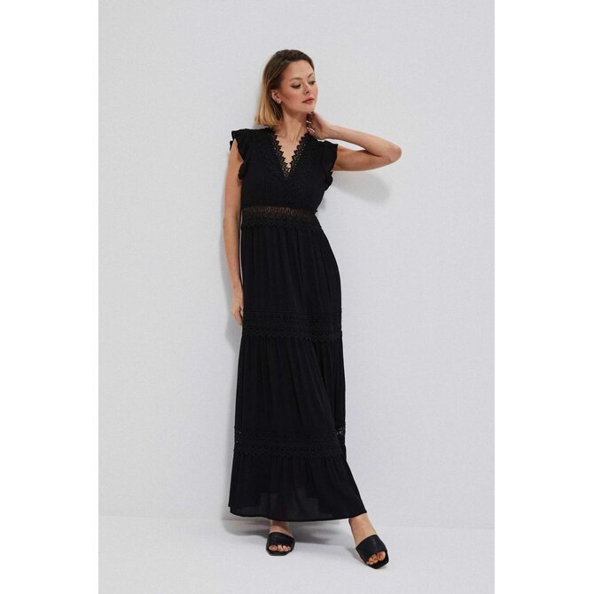 Dlouhé šaty s výstřihem do V vpředu i vzadu. Příjemný viskózový materiál. Tři řady nařasených volánů oddělených krajkovými proužky. Zapínání na zip uprostřed zad. Krásné motýlí rukávy. Délka maxi, délka ke kotníkům. Smyslná krajka dodává celku boho atmosféru. Tento model na letní oslavy musíte mít.