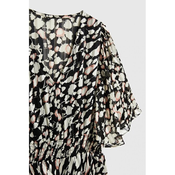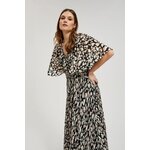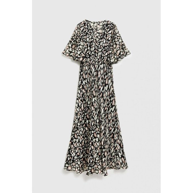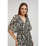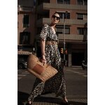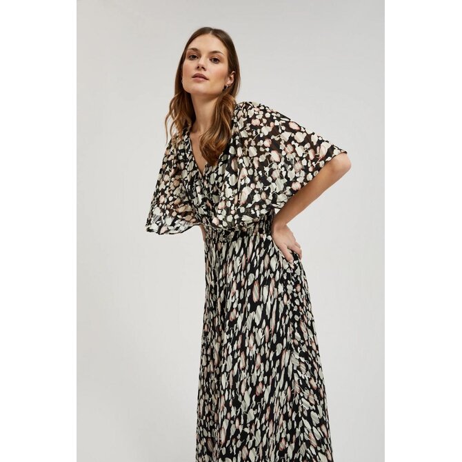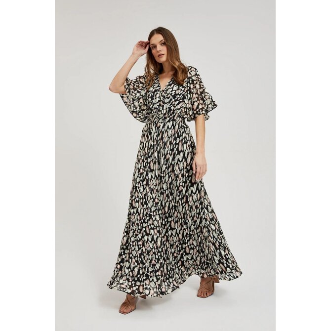 100% POLYESTER, PODŠÍVKA: 100% POLYESTER Elegantní šaty v černé barvě s béžovým vzorem. Je vyrobena z vysoce kvalitního polyesteru, má rozšířené rukávy a volánky, které dodávají mi originalitu. Šaty jsou přiléhavé a rozšířené, což zdůrazňuje ženskou siluetu. Navíc je vybaven elastickým pasem, díky kterému se přizpůsobí postavě. Ideální jak pro zvláštní příležitosti, tak pro každodenní nošení. Je ideální do práce, na pláž i na večerní výlety. Šaty jsou vhodné pro mnoho příležitostí a okouzlí svým stylem. Bude se perfektně hodit jak k lehké bundě do práce, tak k sandálům na pláž. Lze jej nosit samostatně nebo s doplňky, čímž vytvoříte originální styl. Ideální volba pro ženy, které si cení pohodlí a moderního designu.