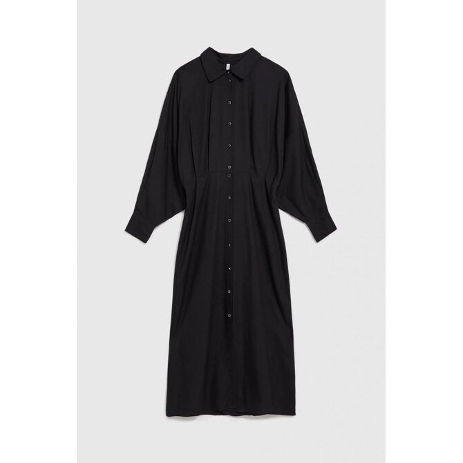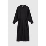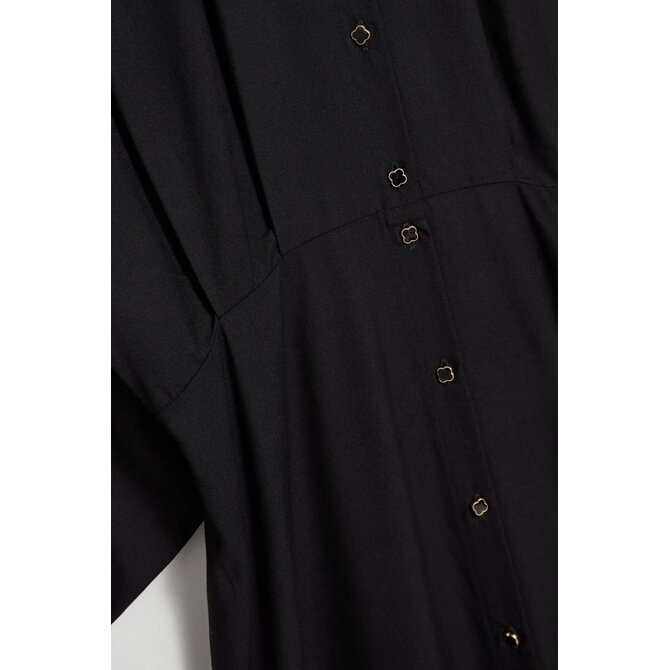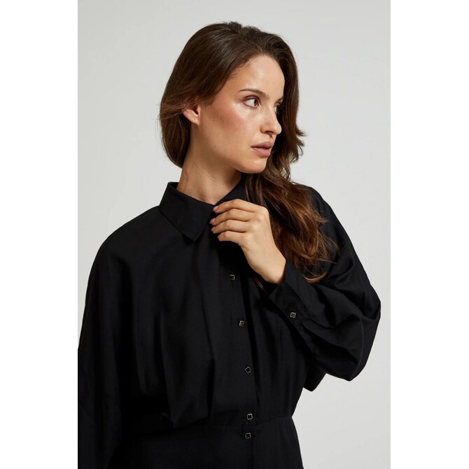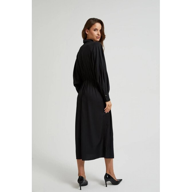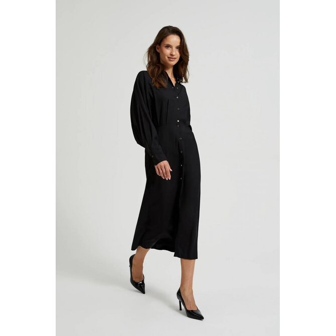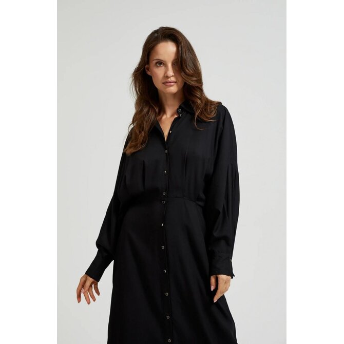 Černé šaty bez vzoru jsou perfektní volbou pro ženy, které oceňují eleganci a minimalismus. Vyrobeno z viskózy, zajišťující pohodlí a komfort nošení. Má límec, manžety, knoflíky a volánky, které mu dodávají kouzlo. Elastický pas zvýrazňuje pas a trapézový střih dělá šaty ženskými a univerzálními. Ideální pro každodenní nošení, do práce i na zvláštní příležitosti. Tyto košilové šaty jsou návrhem pro ženy, které oceňují jednoduchost a eleganci. Díky svému univerzálnímu charakteru se perfektně hodí k mnoha stylům, jak na každý den, tak na zvláštní příležitost. Skvěle se hodí jak ke klasickým vysokým podpatkům, tak ke teniskám. Díky svému klasickému střihu a černé barvě budou šaty spolehlivým základem pro mnoho stylů.