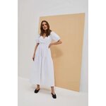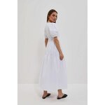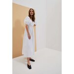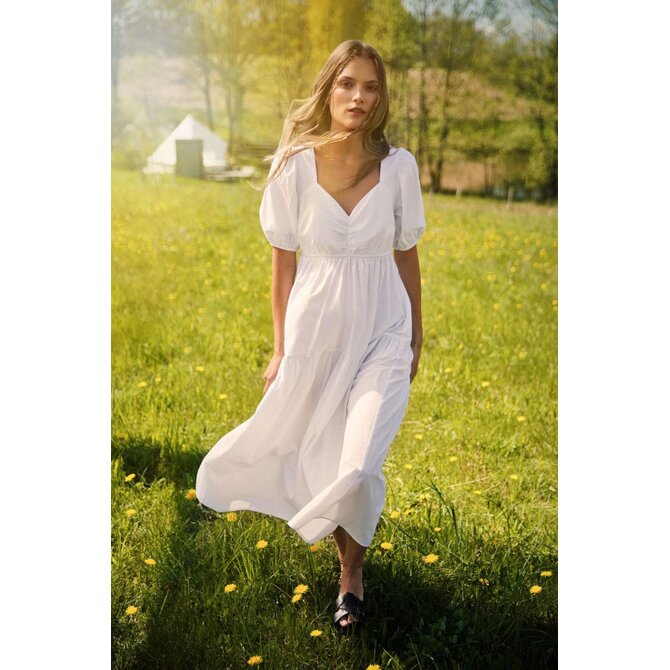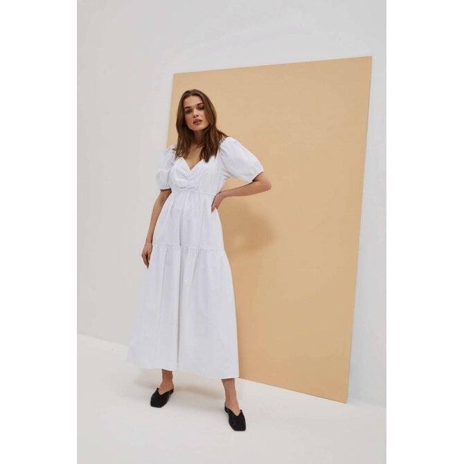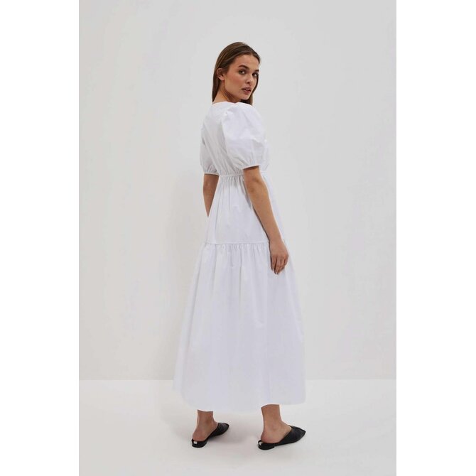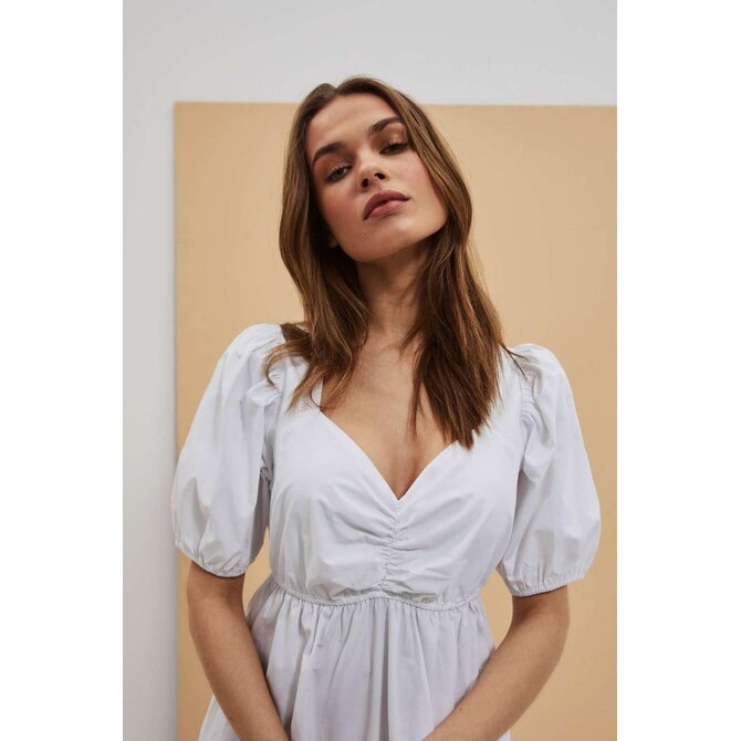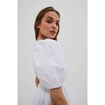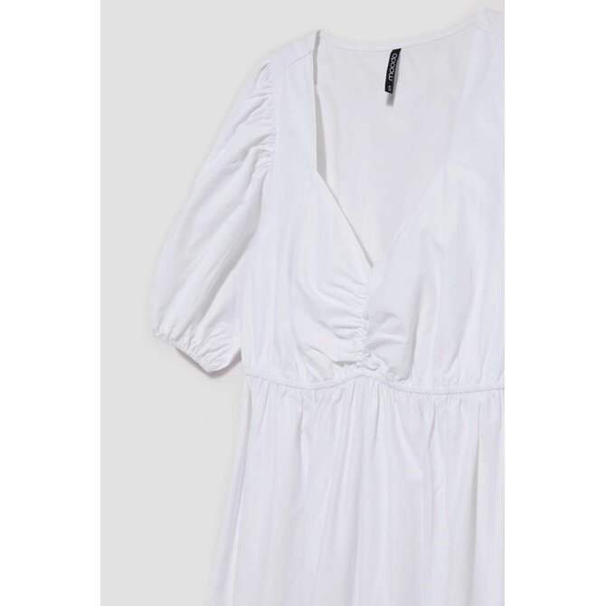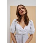 Šaty s bufetovými rukávy: Objete krásu a eleganci v těchto bílých šatech, které jsou vyrobeny z hladké látky bez vzorů. Drzý výstřih dodává šatům svůdný nádech, zatímco bufetové rukávy až k loktům, zakončené žebrovaným lemem, přinášejí módní prvek.