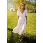 Pas je zvýrazněný a tvaruje siluetu, což vytváří elegantní a ženský vzhled. Spodní část šatů je rozšířená a jemně nařasená, což dodává šatům lehkost a pohyb. Maxi délka zaručuje sofistikovaný dojem.