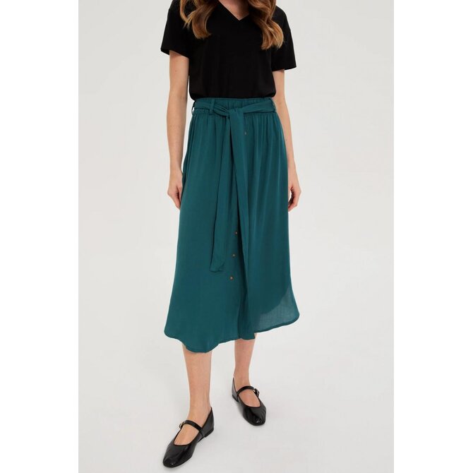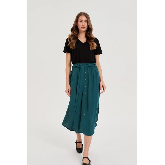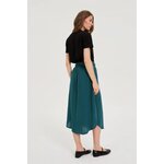 100% VISKÓZA Tato zelená áčková sukně zaujme svou nadčasovou elegancí a výjimečně ženským střihem. Elastický pas zajišťuje pohodlí a perfektní střih. Délka do poloviny lýtek krásně prodlužuje nohy a dodává sukni lehký a stylový vzhled. Použití viskózy dodává materiálu vzdušnost a příjemnost na dotek. Tato zelená áčková sukně je ideální pro každodenní nošení, do práce, na společenská setkání i rodinná setkání. Hodí se ke klasickým košilím, jednoduchým halenkám, svetrům a sakům. Perfektně se hodí k elegantním jehlovým podpatkům, módním kotníkovým botám nebo pohodlným balerínkám a vytvoří tak outfit pro každou příležitost.