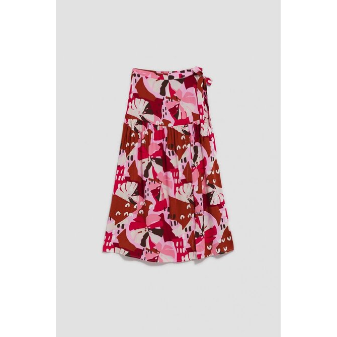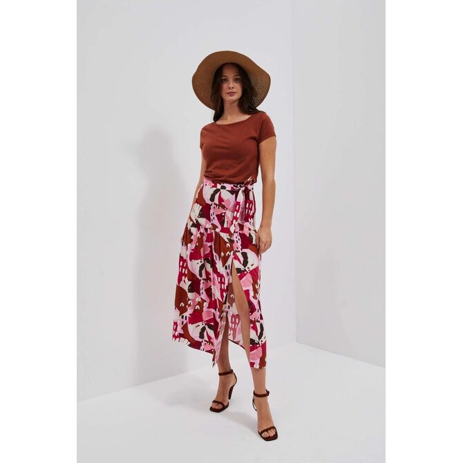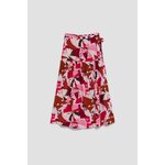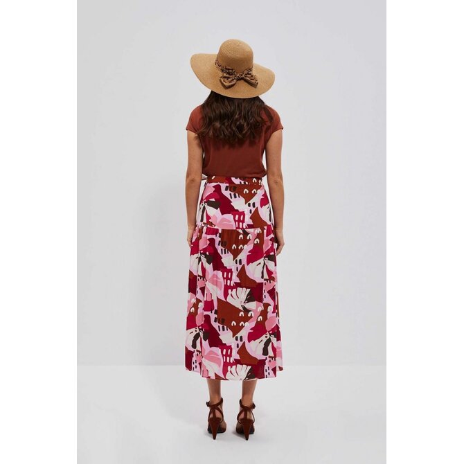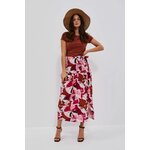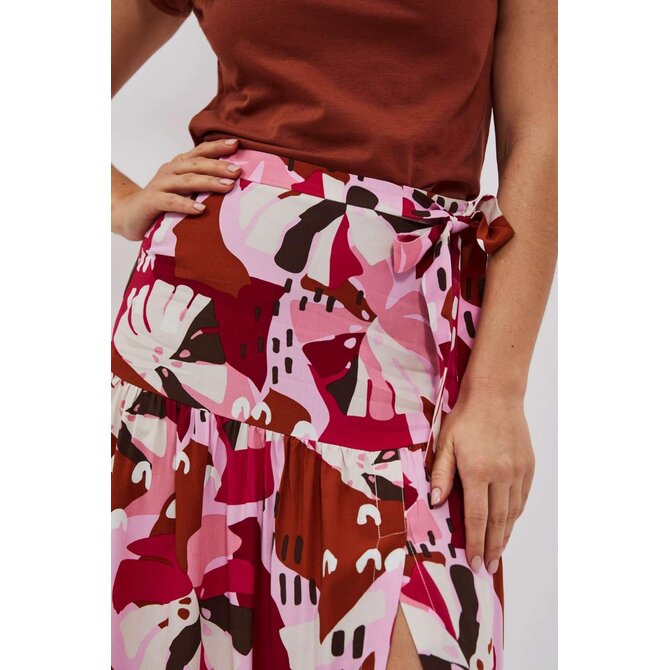 Růžová sukně, celá zdobená efektním potiskem, který přitahuje pozornost. Na linii pasu je ozdobné zavazování, které zvýrazňuje postavu a umožňuje dokonalé padnutí. Sukně je zdobena jemným volánkem a rozparkem materiálu vytvářejícím rozparek. Rozšířený střih dokonale zvýrazňuje ženské tvary a dodává pohybům lehkost. Zapínání na zip. Díky délce do půl lýtek je sukně vhodná pro různé příležitosti - od práce až po setkání s přáteli. Skvělá nabídka pro ženy, které oceňují originální řešení a chtějí prostřednictvím svého šatníku vyjádřit svou individualitu.