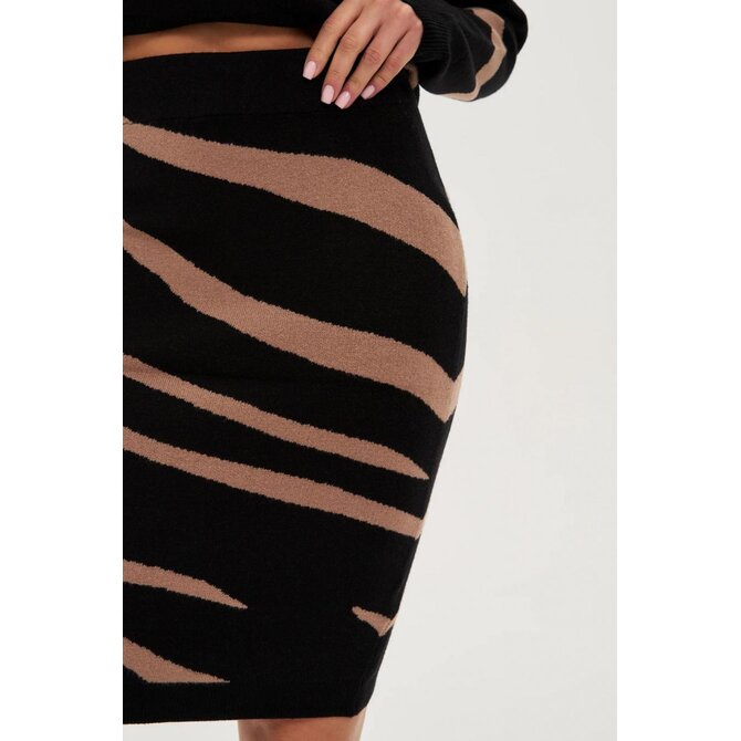 52% VISKÓZA, 28% POLYESTER, 20% POLYAMID Černá pletená sukně s unikátním vzorem. Elastický pas zajišťuje pohodlné nošení, zatímco lehká a vzdušná viskóza zajišťuje příjemný pocit na těle a je ideální pro každé roční období. Skvělá volba pro každodenní nošení, do práce nebo na setkání s přáteli. Tato stylová sukně se dobře hodí k jednoduchému tričku, elegantní halence nebo svetru. Perfektně se hodí k balerínkám, teniskám nebo lodičkám a vytvoří tak módní outfity pro mnoho příležitostí.