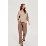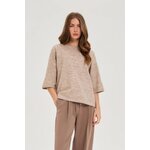54% POLYESTER 38% AKRYL 5% VLNA 3% ELASTAN Tento světle hnědý dámský svetr zaujme svou hladkou texturou a moderním, volným střihem. Kratší rukávy a kulatý výstřih zajišťují pohodlné nošení a zdůrazňují ležérní charakter kousku. Polyesterový materiál dělá svetr lehkým, vzdušným a snadno se udržuje. Absence vzoru mu dodává univerzální, minimalistický vzhled, který dokonale odpovídá současným trendům. Ideální volba pro každodenní práci, schůzky s přáteli nebo víkendové procházky. Perfektně se hodí ke klasickým džínům, elegantním kalhotám nebo midi sukni a vytváří tak stylové a nadčasové outfity. Skvěle vypadá i v kombinaci s lehkým sakem nebo motorkářskou bundou.