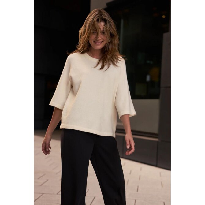 54% POLYESTER 38% AKRYL 5% VLNA 3% ELASTAN Tento krémový dámský svetr v ecru odstínu zaujme svou hladkou texturou a moderním, volným střihem. Kratší rukávy a kulatý výstřih zajišťují pohodlné nošení a zdůrazňují ležérní charakter kousku. Polyesterový materiál dělá svetr lehkým, vzdušným a snadno se udržuje. Absence vzoru mu dodává univerzální, minimalistický vzhled, který dokonale odpovídá současným trendům. Ideální volba pro každodenní práci, schůzky s přáteli nebo víkendové procházky. Perfektně se hodí ke klasickým džínům, elegantním kalhotám nebo midi sukni a vytváří tak stylové a nadčasové outfity. Skvěle vypadá i v kombinaci s lehkým sakem nebo motorkářskou bundou.