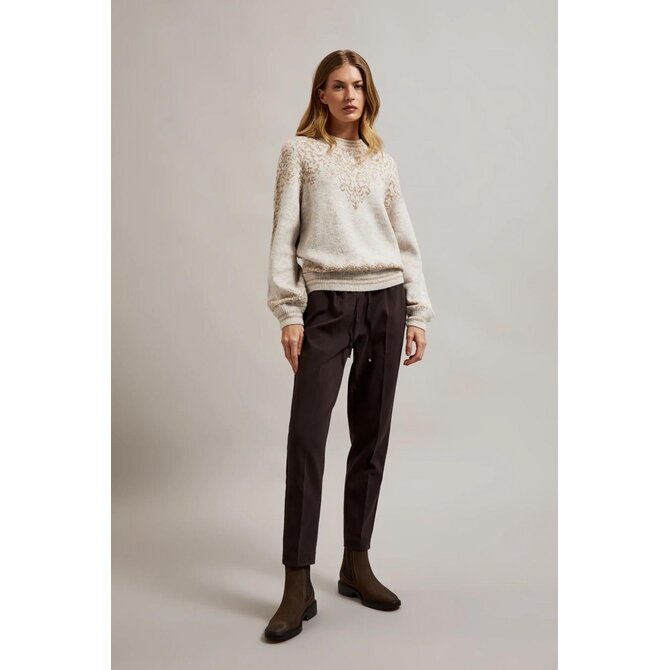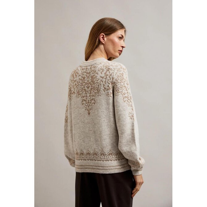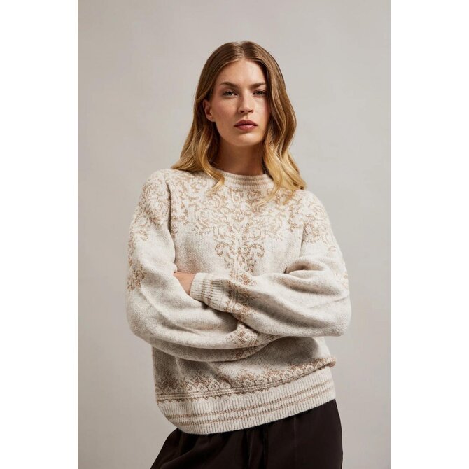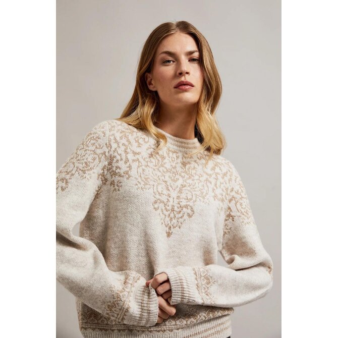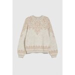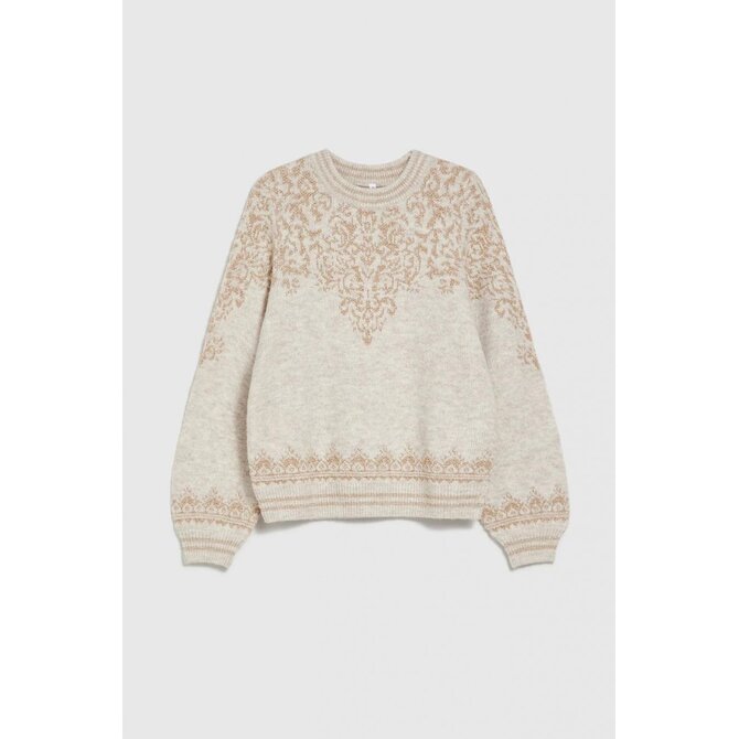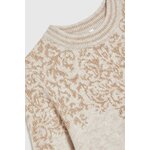 Béžový svetr zdobený jemným ornamentem je mimořádně elegantním a stylovým doplňkem vašeho šatníku. Vyrobeno z akrylu s přídavkem metalické nitě vám poskytne teplo a pohodlí. Dlouhé rukávy a kulatý výstřih jsou ideální pro chladnější dny. Tento svetr se hodí k mnoha příležitostem - jak na setkání s přáteli, tak na důležitou událost. Můžete ji kombinovat jak s elegantními kalhotami, tak s džínami. Díky univerzální béžové barvě ji snadno sladíte k různým stylům.