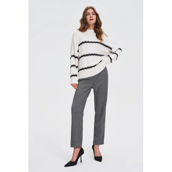 50% VISKÓZA, 28% POLYESTER, 22% POLYAMID Tento krémově zbarvený dámský pruhovaný svetr je perfektní volbou pro chladnější dny. Volný střih se spuštěnými rameny poskytuje výjimečné pohodlí a volnost pohybu. Kulatý rolák a dlouhé rukávy dodávají tomuto kousku nadčasový charakter. Jemná směs viskózy činí látku měkkou a příjemnou na dotek a svetr krásně splývá. Díky jednoduchému designu se skvěle hodí jak k ležérním, tak k elegantnějším outfitům. Je to perfektní volba na procházku, schůzku s přáteli nebo do práce v kanceláři. Tento krémově zbarvený dámský pruhovaný svetr se perfektně hodí ke klasickým džínům, tkaným kalhotám, midi sukním a módním legínám. Krásně se hodí ke kotníkovým botám, teniskám a lodičkám a vytvoří tak pohodlný a stylový základ pro mnoho příležitostí.