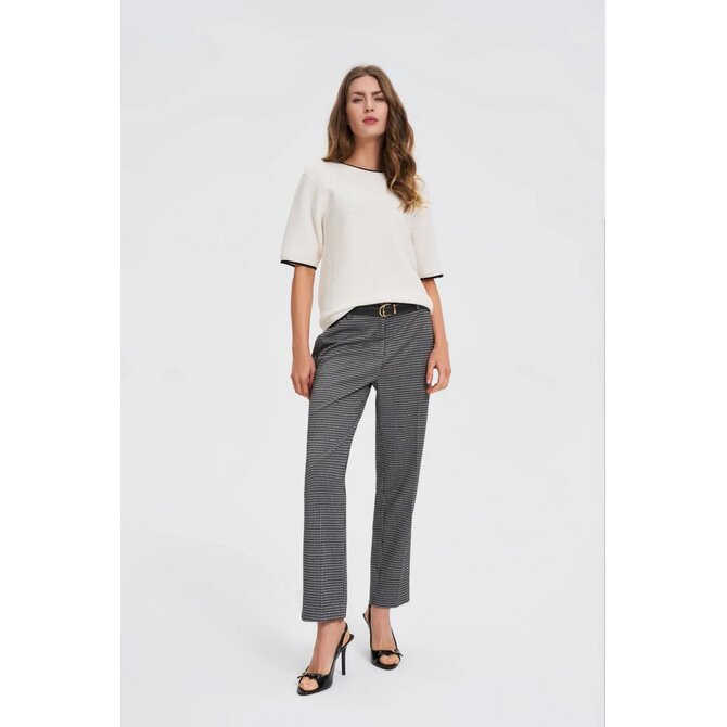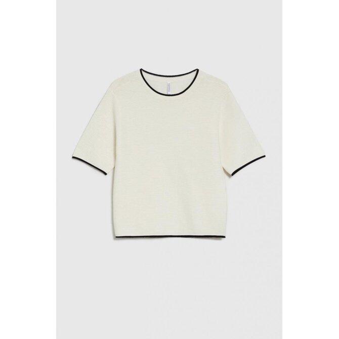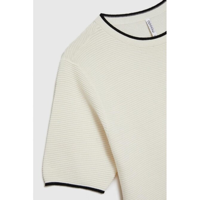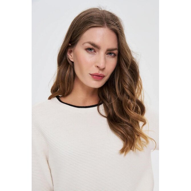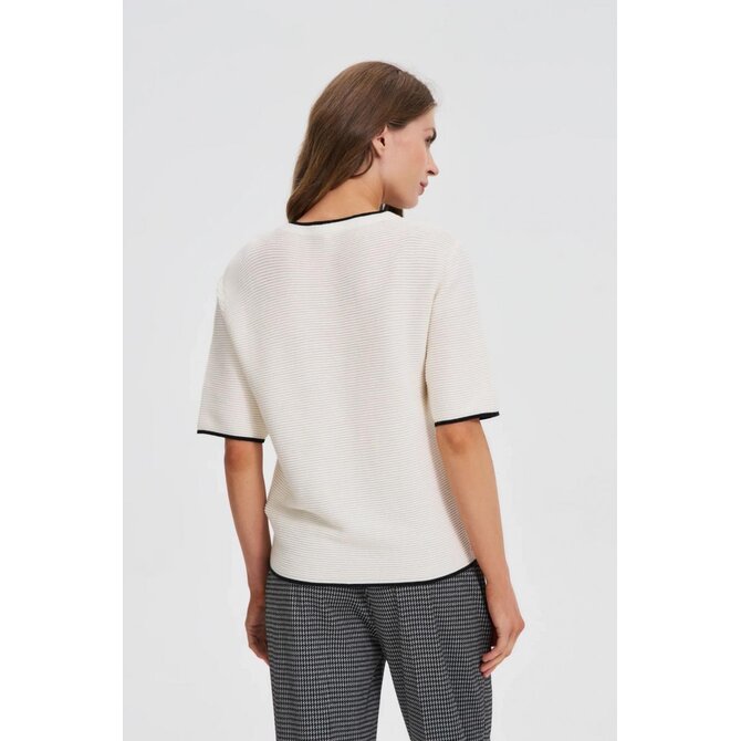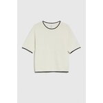 52 % VISKÓZA, 26 % POLYESTER, 22 % POLYAMID. Tento klasický krémový svetr se pyšní hladkou, jednotnou texturou a decentní elegancí. Krátké rukávy a kulatý výstřih zajišťují pohodlí a snadné nošení po celý den, zatímco měkká viskóza zaručuje příjemný pocit na pokožce. Tento svetr je ideální pro každodenní schůzky, práci nebo rodinná setkání. Dobře se hodí k látkovým kalhotám, klasickým džínům, pouzdrovým sukním nebo plisovaným sukním, a vytváří tak styly vhodné pro mnoho příležitostí.