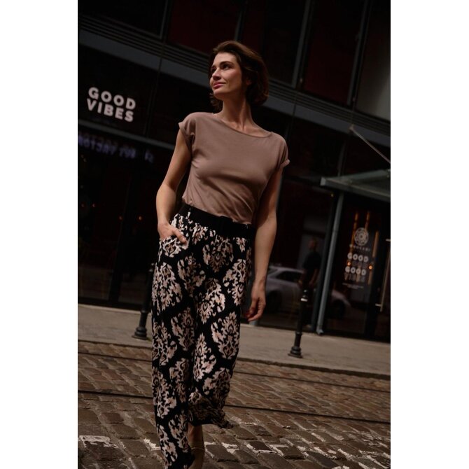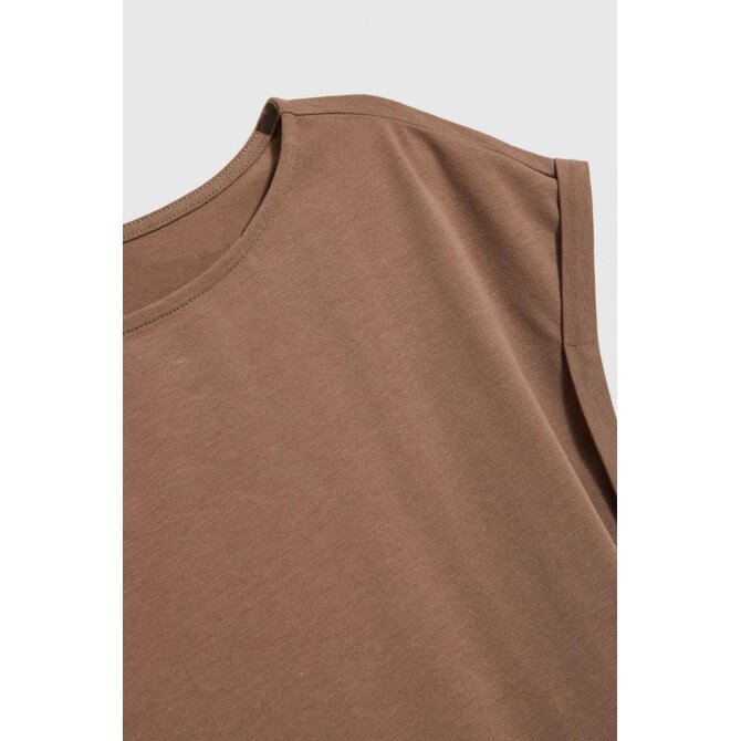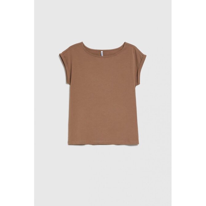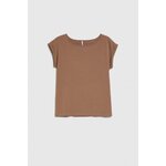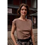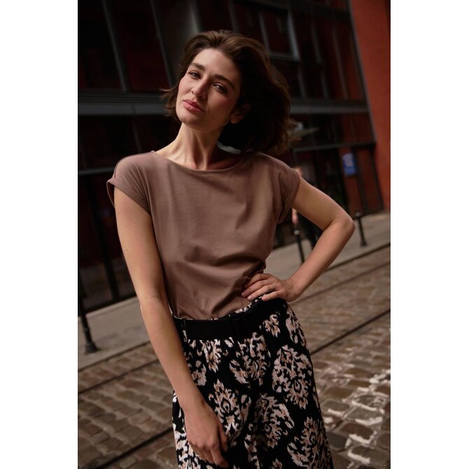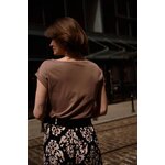 Tato dámská halenka v hnědých odstínech je perfektní volbou pro každodenní styling. Hladká a nevzorovaná, zaujme svým minimalistickým designem, který zdůrazňuje všestrannost a nadčasový charakter. Volný střih se spuštěnými rameny zaručuje volnost pohybu a pohodlí po celý den, zatímco lodičkový výstřih decentně zvýrazňuje dekolt a dodává siluetě nádech lehkosti. Vyrobena z měkké, příjemné bavlny na dotek, zajišťuje prodyšnost a pohodlí i v horkých dnech. Perfektně se hodí k džínům, kraťasům nebo sukním a vytvoří tak módní a pohodlné outfity pro každou příležitost.
