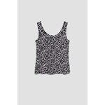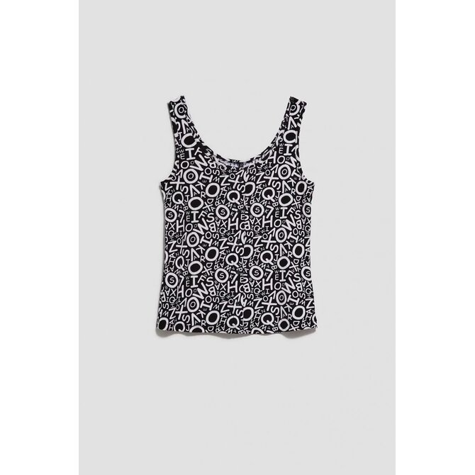 95% POLYESTER 5% ELASTAN Černý top, celoplošný vzor bílých písmen v různých velikostech. Kulatý výstřih. Vypasovaný střih. Vyrobeno z příjemného materiálu, díky přidání elastických vláken se skvěle přizpůsobí siluetě. Skvěle se hodí ke kalhotám a sukni nebo pod sako. Perfektní pro každodenní použití i do práce.