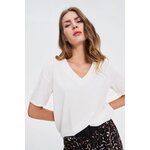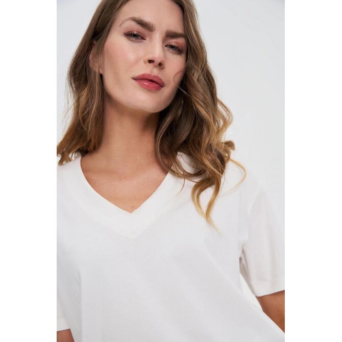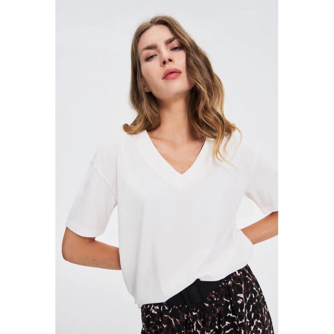 95% BAVLNA, 5% ELASTAN Tato ecru halenka zaujme svým minimalistickým, hladkým, nevzorovaným povrchem a volným střihem, který zajišťuje naprosté pohodlí. Krátké rukávy a výstřih do V decentně zdůrazňují siluetu a dodávají celému vzhledu nádech lehkosti. Přírodní směs bavlny umožňuje pokožce dýchat a zajišťuje příjemný pocit svěžesti po celý den. Je to perfektní volba pro každodenní nošení do práce, na schůzky s přáteli nebo na pohodovou procházku. Perfektně se hodí ke klasickým džínům, lehkým látkovým kalhotám nebo letní sukni.