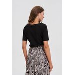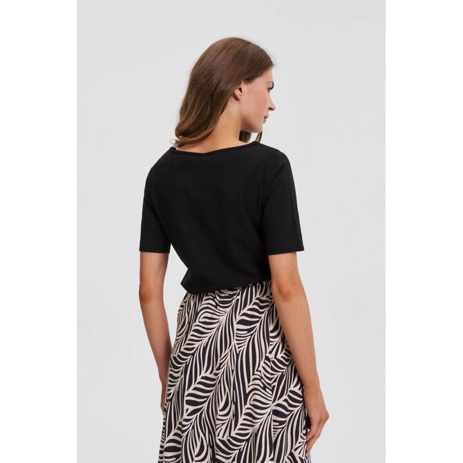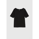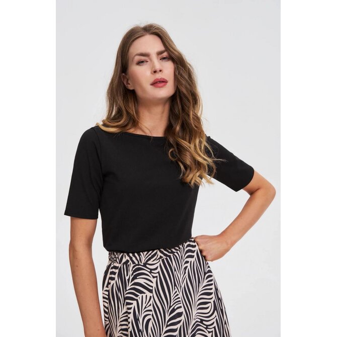95% BAVLNA, 5% ELASTAN Tato černá halenka s hladkou texturou je nadčasovou volbou pro milovnice minimalistického stylu. Přiléhavý střih lichotí postavě, zatímco výstřih ve tvaru lodičky dodává decentní eleganci. Krátké rukávy zajišťují pohodlí v teplejších dnech a zároveň umožňují volnost pohybu. Přírodní, měkká bavlna zaručuje celodenní pohodlí a prodyšnost, díky čemuž je halenka příjemná na dotek a šetrná k pokožce. Ideální pro každodenní nošení, do práce i na schůzky s přáteli. Perfektně se hodí ke klasickým džínům, pouzdrové sukni a elegantním cigaretovým kalhotám. Hodí se také jako základní vrstva pod sako nebo kardigan.