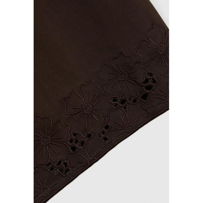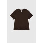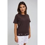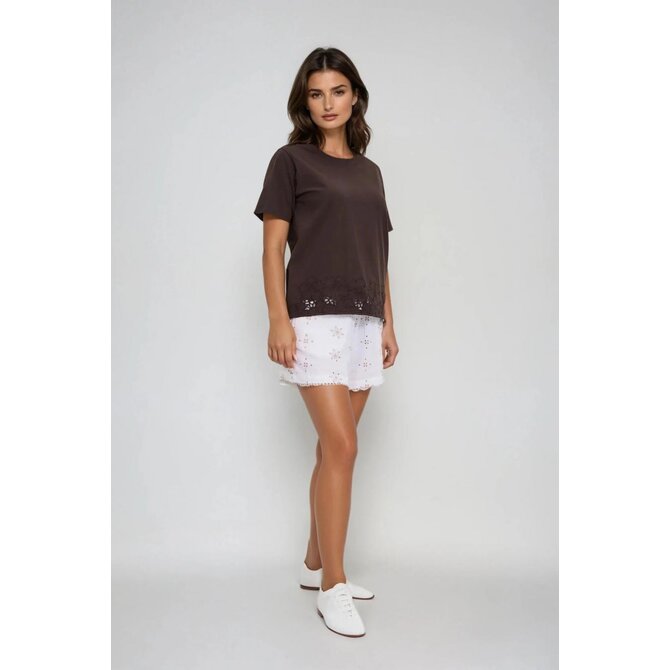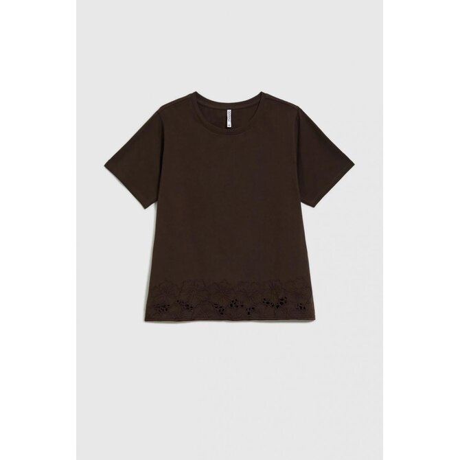 95% BAVLNA, 5% ELASTAN. Toto jednoduché hnědé tričko má kulatý výstřih, krátké rukávy a jednoduchý střih. Ve spodní části je vyšívaný květinový vzor. Je perfektním základem pro různé styly.