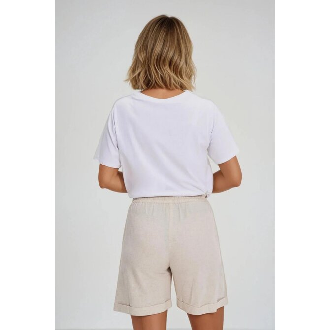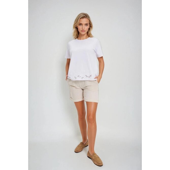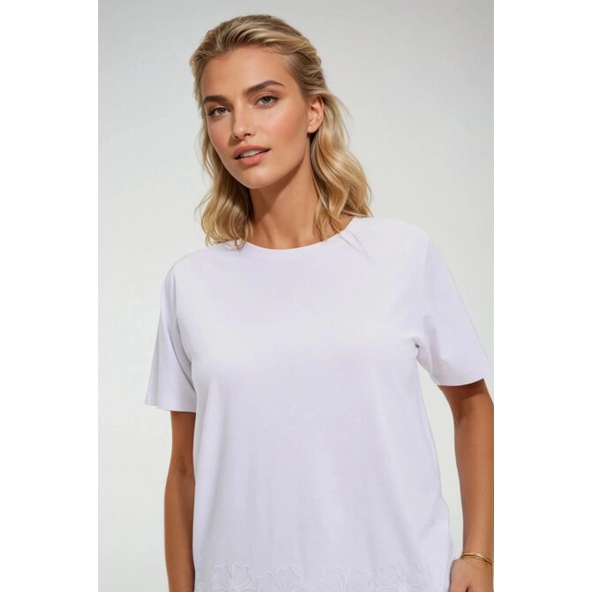 95% BAVLNA, 5% ELASTAN. Toto obyčejné bílé tričko má kulatý výstřih, krátké rukávy a jednoduchý střih. Ve spodní části je vyšívaný květinový vzor. Je perfektním základem pro různé styly.