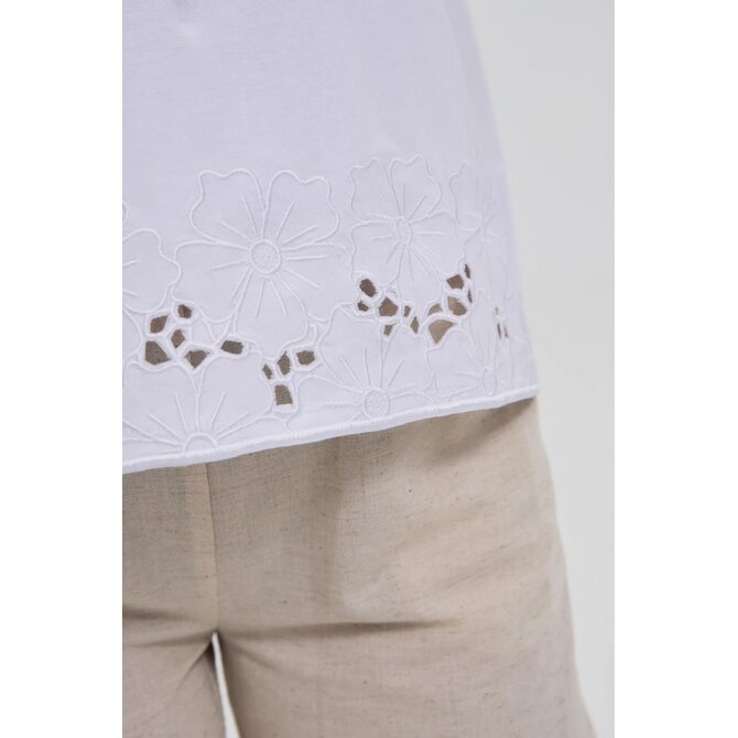 95% BAVLNA, 5% ELASTAN. Toto obyčejné bílé tričko má kulatý výstřih, krátké rukávy a jednoduchý střih. Ve spodní části je vyšívaný květinový vzor. Je perfektním základem pro různé styly.
