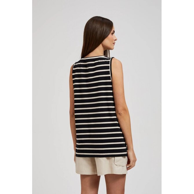 95% BAVLNA 5% ELASTAN Černý halenkový top s dominantním pruhovaným vzorem je perfektní pro teplé dny. Vyrobeno z vysoce kvalitní bavlny, zaručuje pohodlí a skvělý střih. Model bez ramínek s kulatým výstřihem a bez rukávů, díky čemuž je ideální pro letní styling. Pruhovaná halenka je perfektní volbou pro neformální schůzky, rande nebo večerní výlety. Skvěle se hodí k džínům, šortkám i sukni. Můžete jej spárovat s teniskami, balerínkami a podpatky a vytvořit tak různé styly. Ideální nabídka pro ženy, které oceňují pohodlí a módní vzhled.