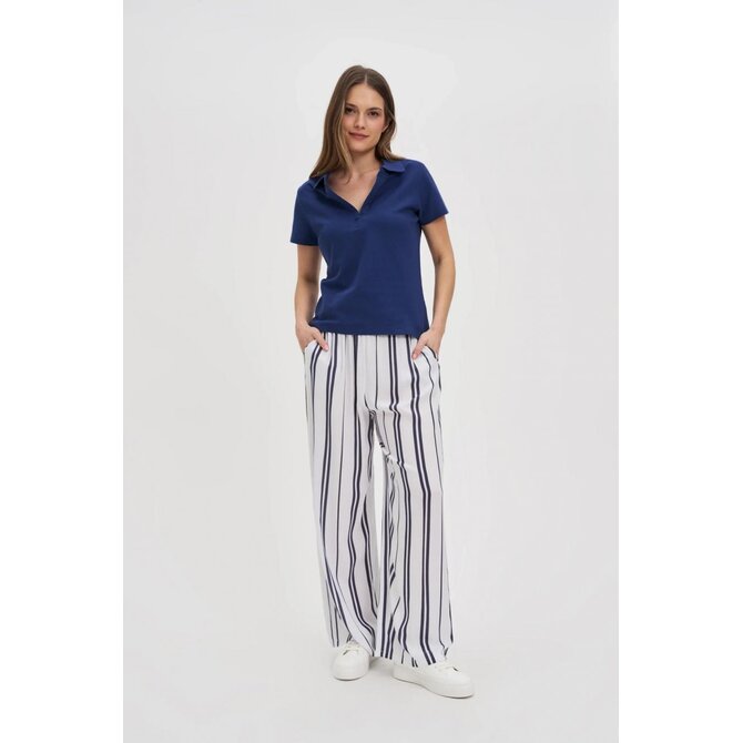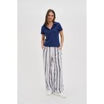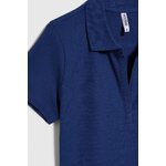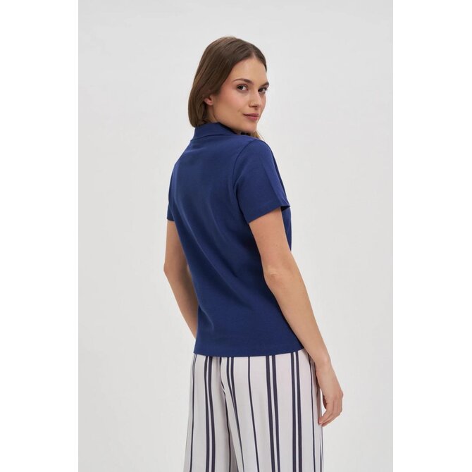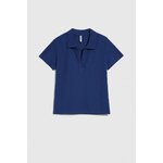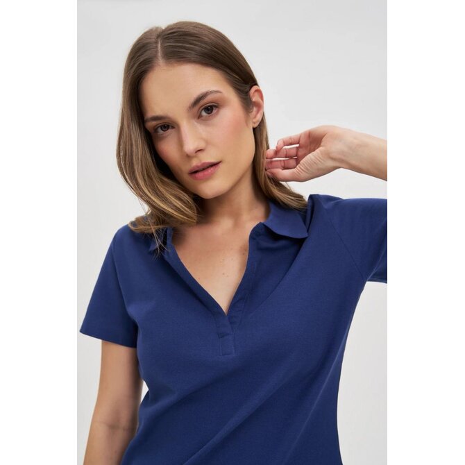 100% BAVLNA Dámská halenka v tmavě modré barvě, bez vzoru, z hladké bavlny. Má límec a krátké rukávy, což zajišťuje pohodlné nošení. Produkt se přizpůsobí siluetě a zdůrazní její přednosti. Ideální pro každodenní použití, pro ležérní styling. Hodí se k džínám, sukním i pod sako, čímž vytváří univerzální a módní kombinace.