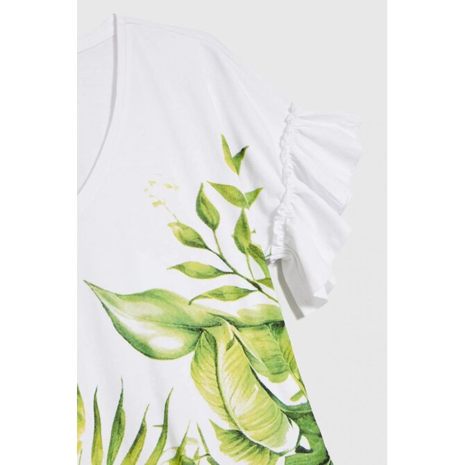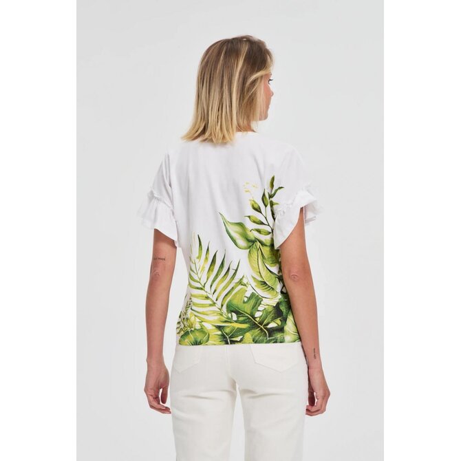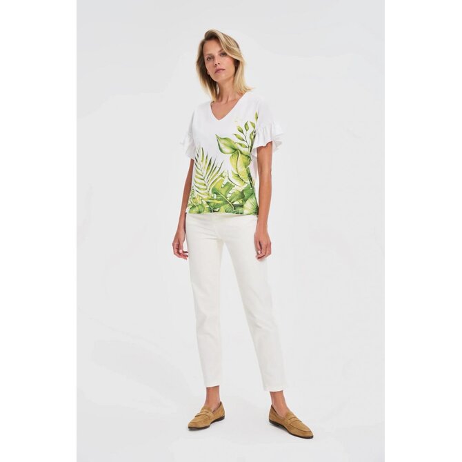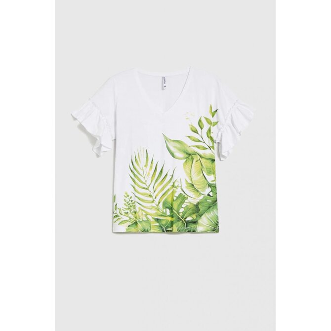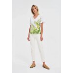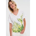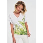 100% BAVLNA Halenka s rostlinným potiskem v odstínech bílé přitahuje pozornost originálním listovým vzorem, který zdůrazňuje přirozený styl a svěžest stylingu. Výstřih do V prodlužuje krk a volánky a rozšířené rukávy dodávají lehkost a decentní eleganci. Volný střih zajišťuje pohodlí při nošení po celý den a vzdušná bavlna zaručuje pohodlí i v teplých dnech. Jemný potisk a neobvyklý střih činí halenku dokonale vhodnou do aktuálních trendů dámské módy. Ideální pro setkání s přáteli, neformální výlety, letní procházky i neformální příležitosti. Skvěle se hodí k džínům, lněným kalhotám, kraťasům nebo midi sukni a vytváří tak jedinečné styly pro každou denní dobu.