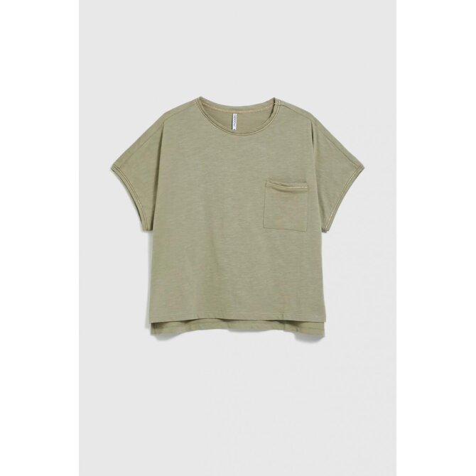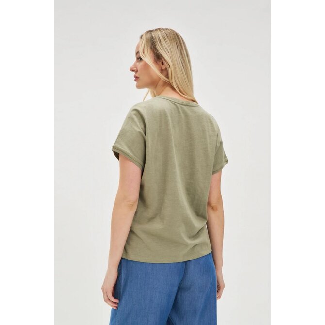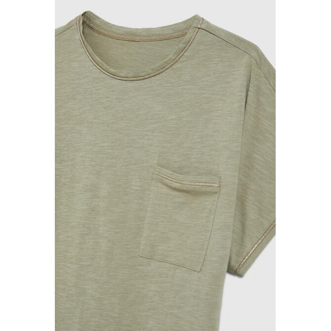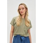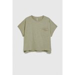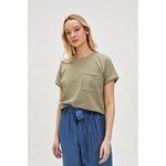 100% BAVLNA Dámská halenka v módní olivově zelené barvě je perfektní volbou pro každé roční období. Hladká textura a absence vzoru zdůrazňují minimalistický charakter a volný, nadměrný střih zajišťuje volnost pohybu a pohodlí při nošení. Krátké rukávy dodávají halence lehkost, díky čemuž je ideální pro teplejší dny. Dekorativní páska a kovová nit na kapse dodávají jemný lesk, který přitahuje pozornost a dodává celému předmětu jedinečný charakter.
