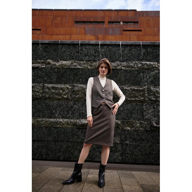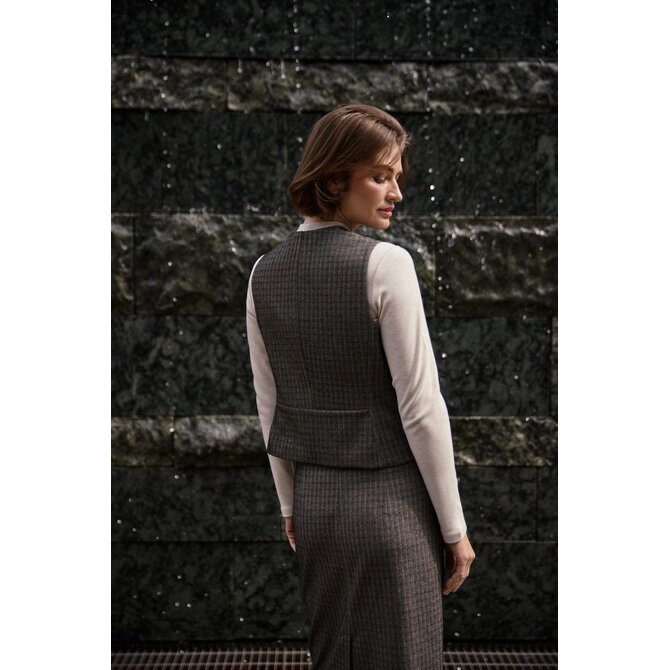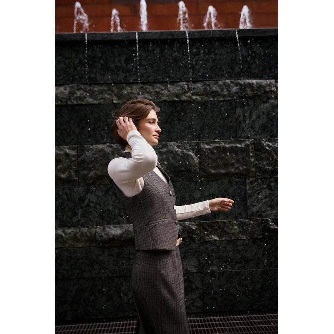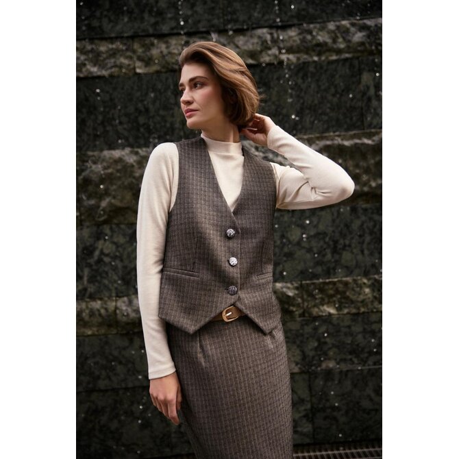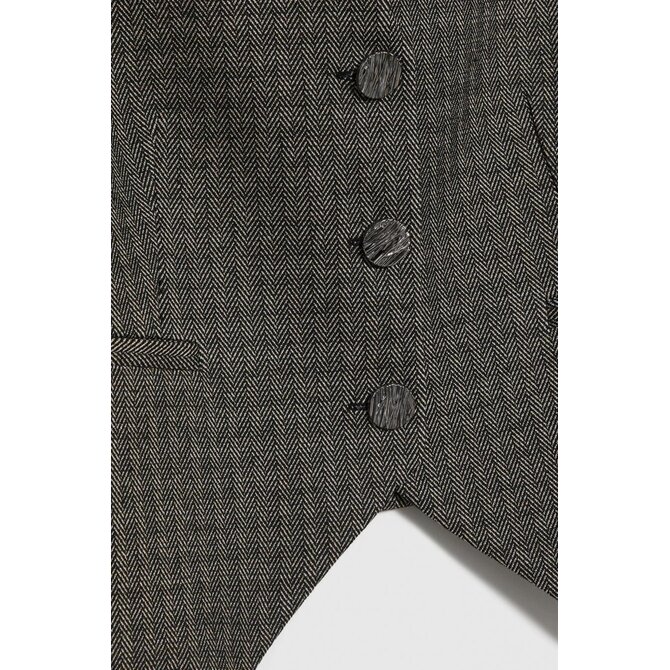 68,3 % POLYESTER, 20,7 % VISKÓZA, 8 % METALICKÁ NIT, 3 % ELASTAN, PODŠÍVKA: 100 % POLYESTER. Tato tmavě béžová vesta s motivem rybí kosti je nadčasový a všestranný kousek. Pečlivě vyrobená, má praktické kapsy a pohodlné zapínání na knoflíky, které dodávají eleganci a funkčnost. Podšívka zajišťuje celodenní pohodlí, zatímco moderní střih vytváří štíhlou a módní siluetu. Materiál je vyroben z měkkého polyesteru s podšívkou, která zajišťuje odolnost a snadnou údržbu. Je ideální volbou pro každodenní nošení, práci a zvláštní příležitosti, kde je elegance a pohodlí klíčové. Perfektně se hodí k látkovým kalhotám, klasickým džínům a pouzdrové sukni. Perfektně se hodí ke košili nebo lehkému svetru a vytvoří stylový outfit pro každé roční období.