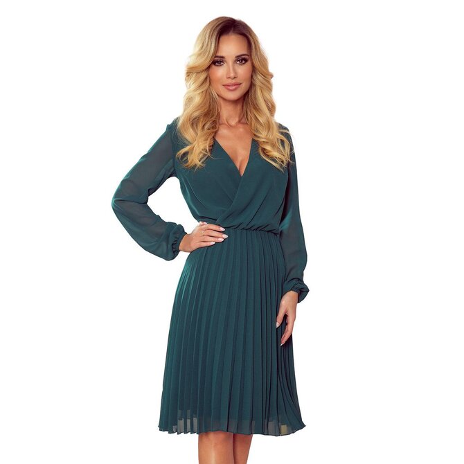 Skládané šifónové šaty s výstřihem a dlouhým rukávem. Barva: láhev zelená. Mark Numoco. Polská produkce.