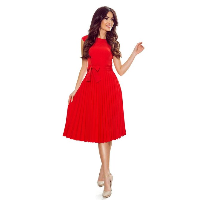 Skládané šaty s krátkými rukávy a pásem. Připíná se vzadu zakrytým zipem.