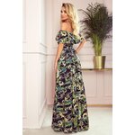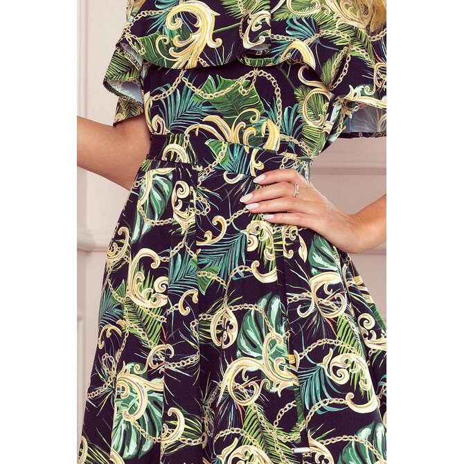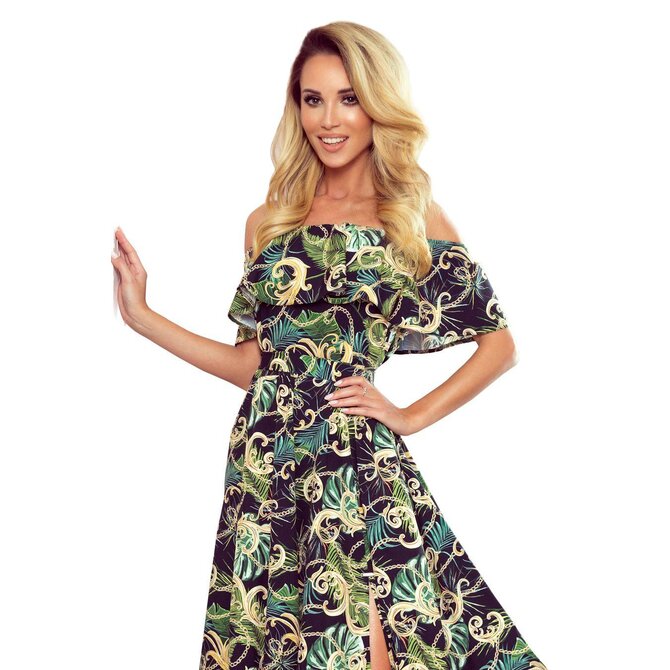 Dlouhé maxi šaty s límcem - černé se zelenými listy a zlatými řetízky.