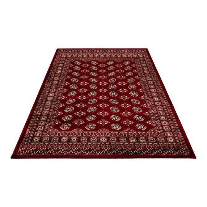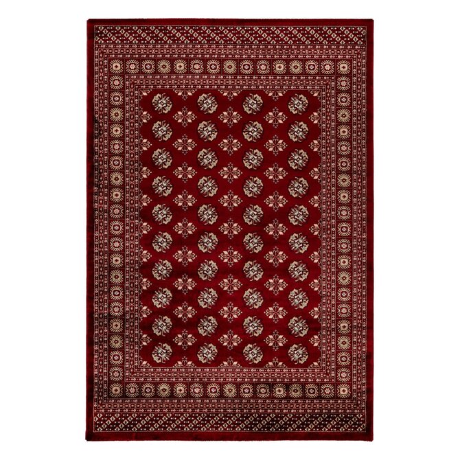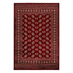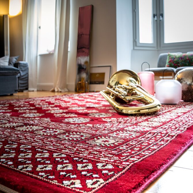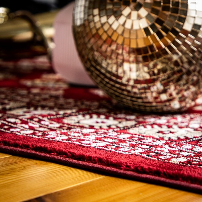 Výrazně červený koberec má propracovaný středový motiv s několika vrstvami lemování od tenkých proužků po větší ornamenty. Jedná se o orientální kousek vyrobený z polyesteru. V kombinaci se středně vysokým střiženým vlasem je koberec velmi příjemný na došlap, a proto se nejlépe hodí k posteli nebo pohovce. Můžete ho bez obav položit i na podlahové topení.