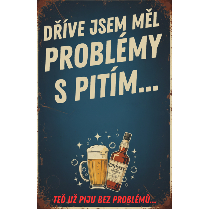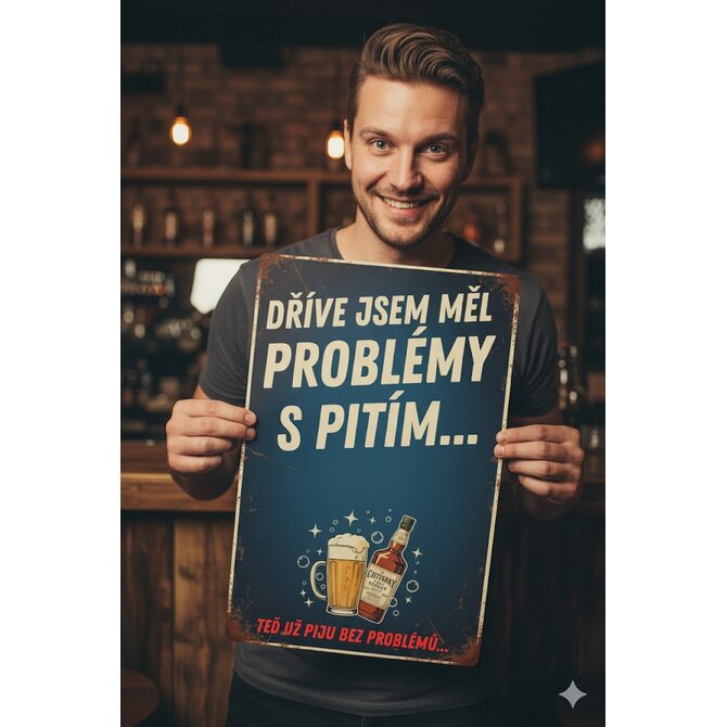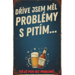 Plechová retro cedule - Dříve jsem měl problémy s pitím... Provedení: Hliník: 30 x 20 cm