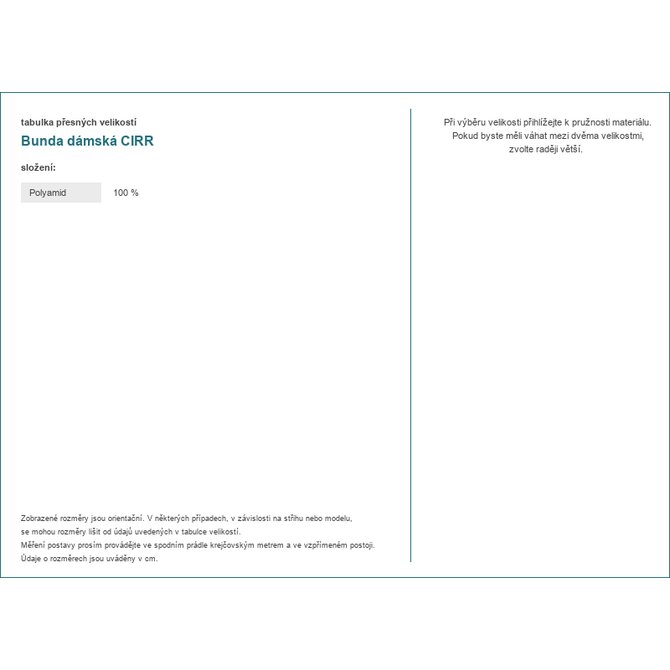 Rozměry bundy ve velikosti S měřeno v plochém stavu: šířka v podpaží - 54 cm, délka rukávu - 66 cm (od švu), šířka v bocích - 53 cm, celková délka - 68 cm.