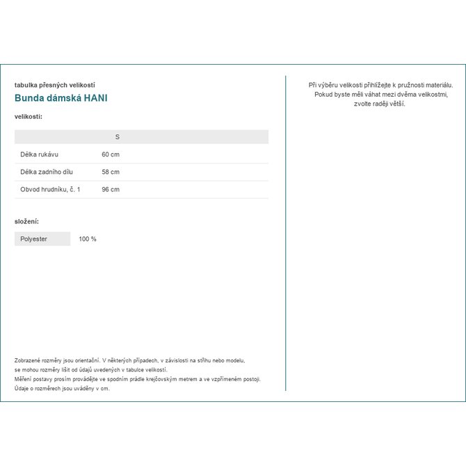 Rozměry bundy ve velikosti S měřeny naplocho: šířka v podpaží - 48 cm, celková délka - 58 cm, délka rukávu - 60 cm.