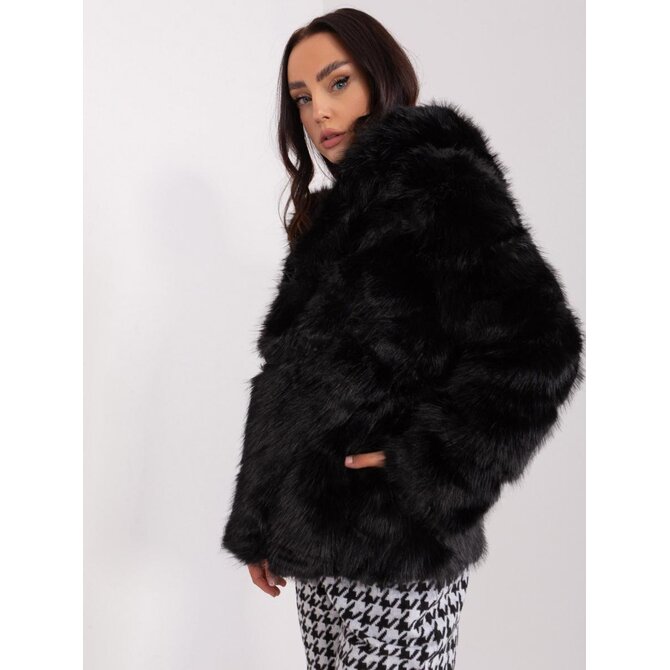 Přechodová bunda z eko kožešiny s kapucí a s podšívkou, zapínání na háček v černé barvě