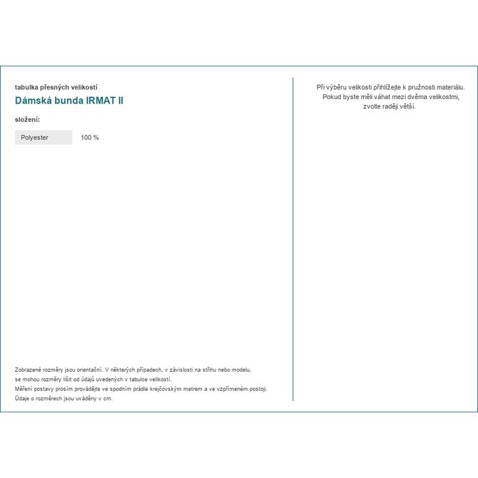 Rozměry bundy ve velikosti M měřeno v plochém stavu: šířka v podpaží - 51 cm, délka rukávu - 59 cm, celková délka - 71 cm.