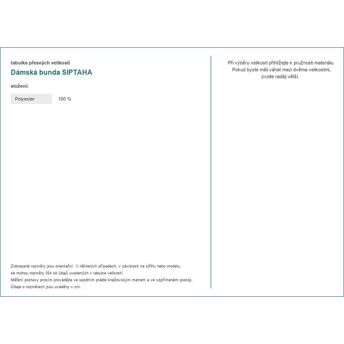 Rozměry bundy ve velikosti S měřeno v plochém stavu: šířka v podpaží - 48 cm, celková délka - 63 cm, délka rukávu - 57 cm.
