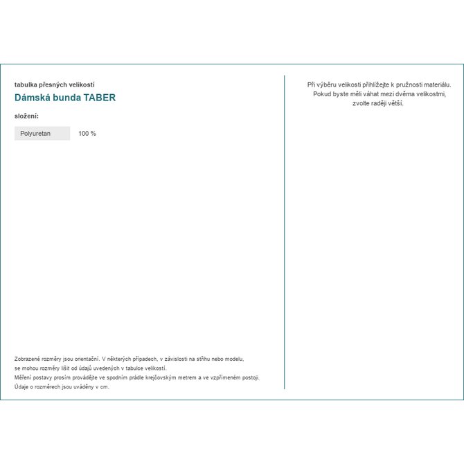 Rozměry bundy ve velikosti S měřeno v plochém stavu: šířka v podpaží - 50 cm, délka rukávu - 53 cm, šířka v bocích - 42 cm, celková délka - 51 cm.