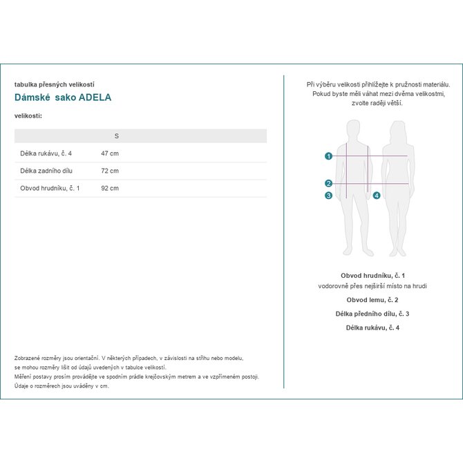 Rozměry bundy ve velikosti S, měřeno naplocho: šířka v podpaží - 46 cm, celková délka - 72 cm, délka rukávu - 47 cm.