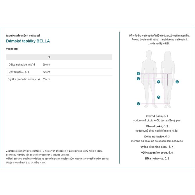 Rozměry kalhot ve velikosti S, měřeno naplocho: šířka pasu - 36 cm, výška pasu - 33 cm, celková délka - 99 cm.