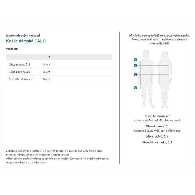 Rozměry halenky velikosti S, měřeno naplocho: šířka v podpaží - 47 cm, délka rukávu - 44 cm, celková délka - 65 cm