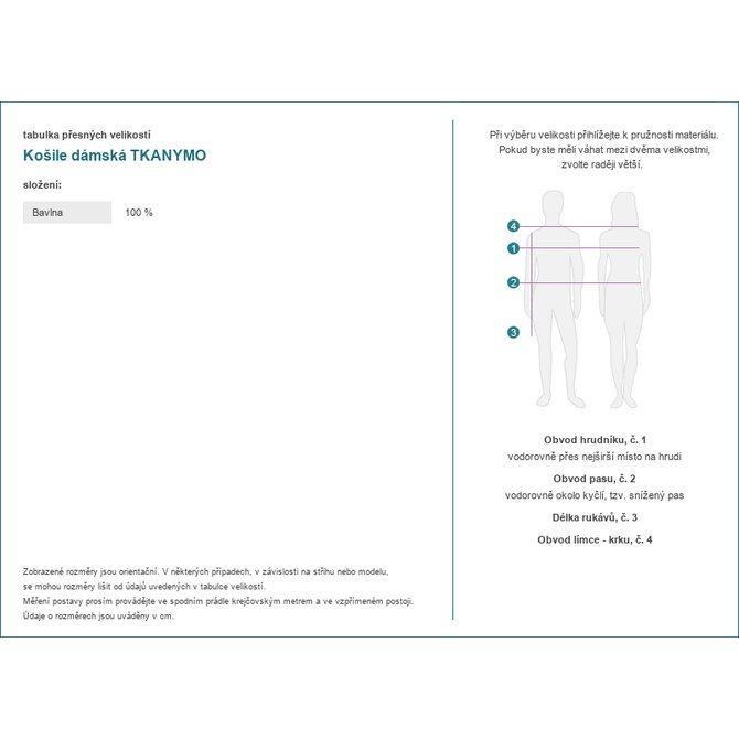 Rozměry košile ve velikosti S měřeno v plochém stavu: šířka v podpaží - 56 cm, délka rukávu - 50 cm (od švu), šířka v bocích - 59 cm, celková délka - 67 cm.