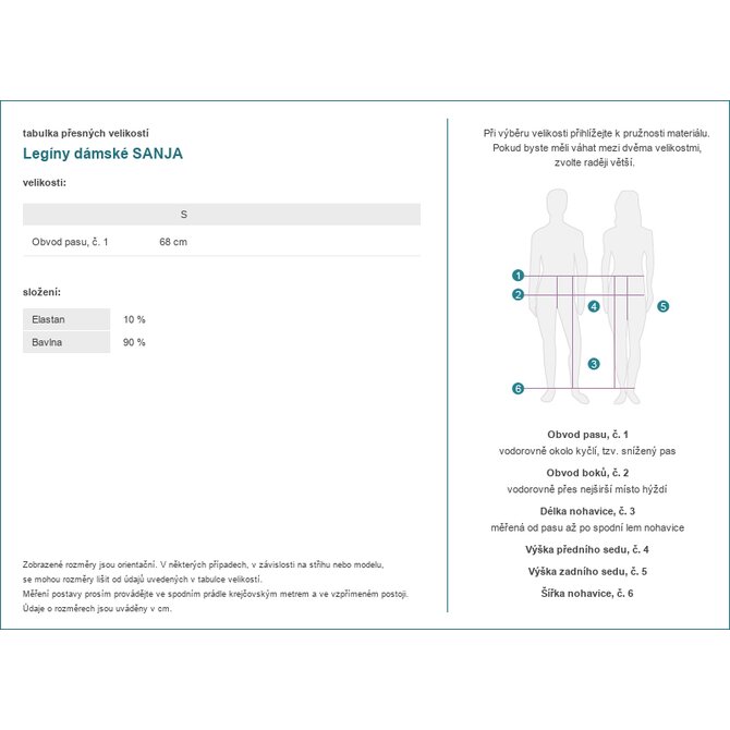 Rozměry legín velikosti S jsou měřeny naplocho bez natažení: šířka pasu - 34 cm, celková délka - 102 cm, výška pasu - 31 cm