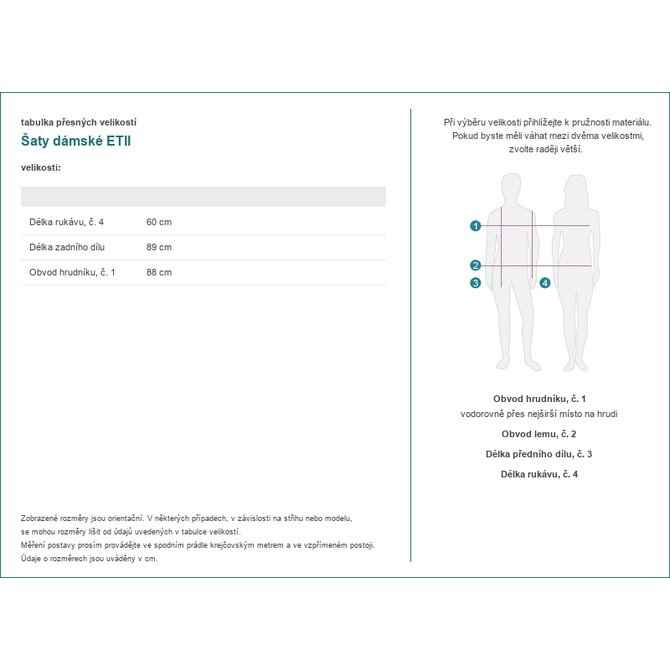 Rozměry šatů v jedné velikosti měřeno naplocho: šířka v podpaží - 49 cm, celková délka - 89 cm, délka rukávu - 60 cm