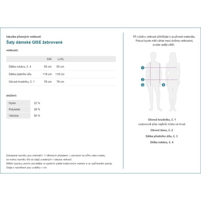 Rozměry šatů velikosti S/M měřeny naplocho: šířka pod pažemi - 39 cm, délka rukávu - 55 cm, celková délka - 117 cm.