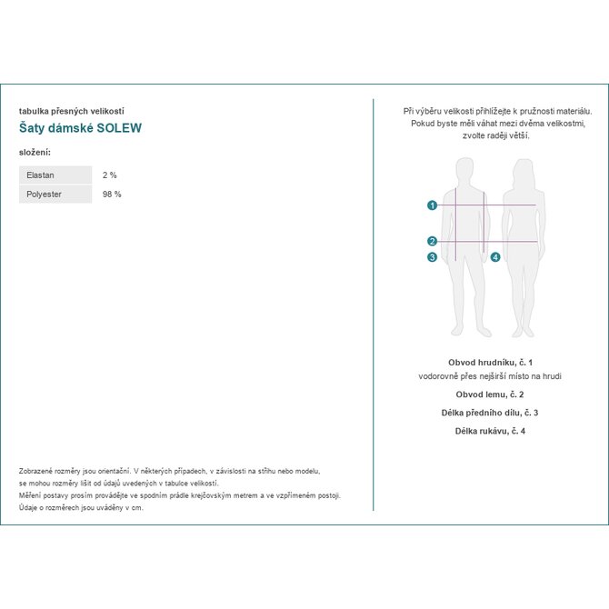 Rozměry šatů v jedné velikosti: šířka v podpaží - 50 cm, šířka v pase - 35 cm, délka rukávu - 61 cm, šířka v bocích - 70 cm, celková délka - 93 cm.