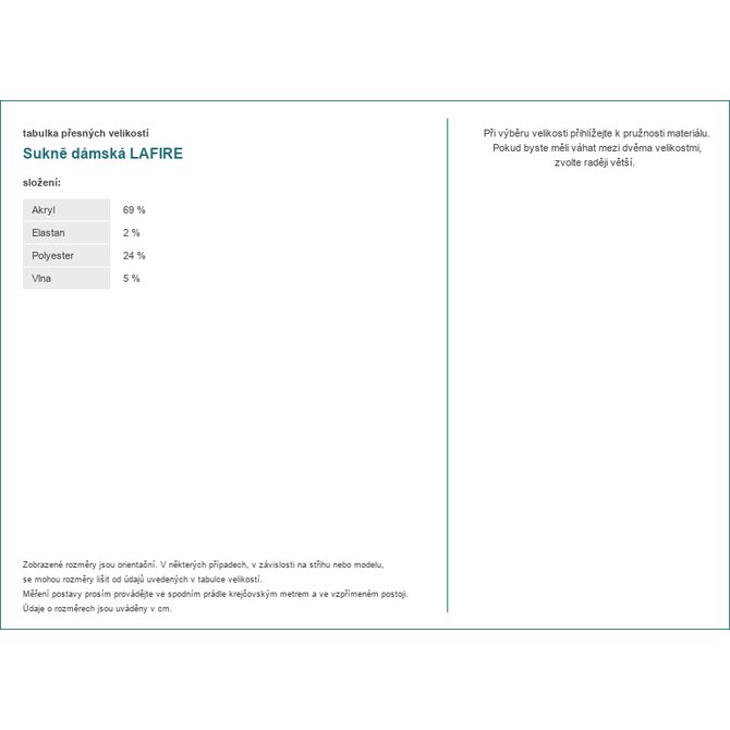 Rozměry sukně ve velikosti S měřeno v plochém stavu: šířka pasu - 35 cm (plochá), šířka pasu - 62 cm (po natažení), šířka boků - 41 cm, celková délka - 75 cm (pružný materiál).