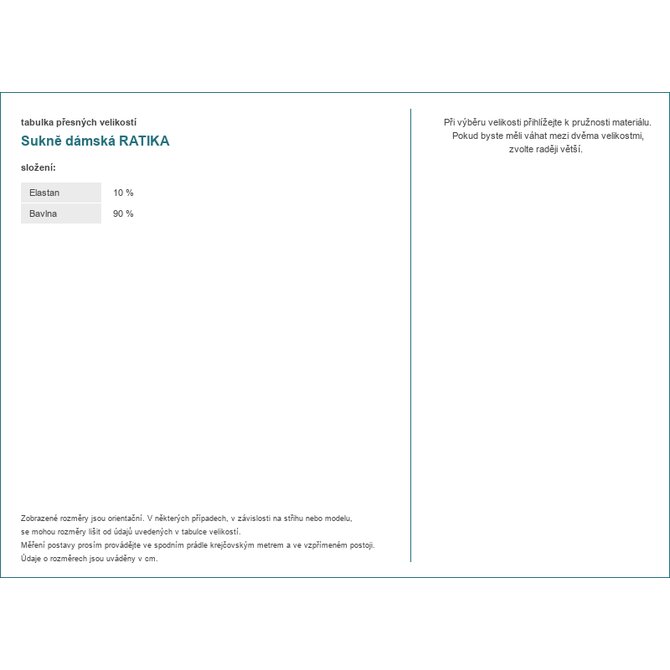 Rozměry sukně ve velikosti S/M: šířka pasu - 32 cm (v rozloženém stavu), šířka pasu - 63 cm (po natažení), šířka boků - 37 cm, celková délka - 57 cm.